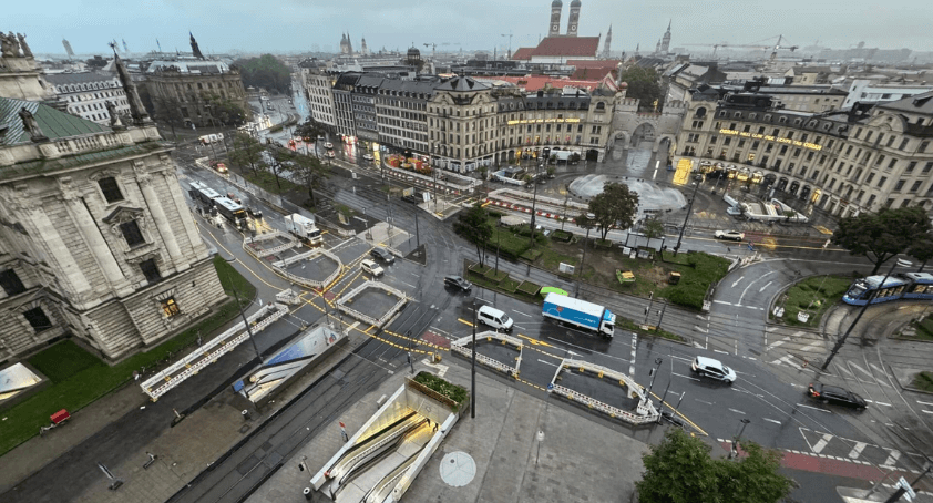 Au cœur de Munich, sur la Karlsplatz, l’un des nœuds de transport urbain les plus fréquentés, un chantier combinant tramway, voirie et ouvrages souterrains devait être mené en site hypercontraint, en coordination avec plusieurs parties prenantes (SWM, MVG, Stadtwerke, etc.).
